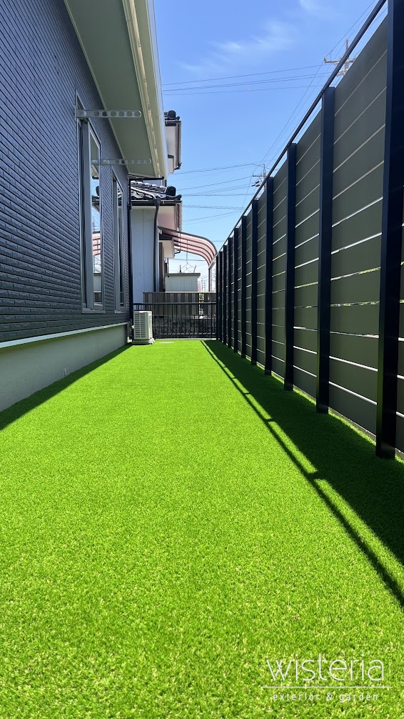 お庭は全面人工芝を張りました。背の高い目隠しフェンスを設置して外からの視線をカットします。