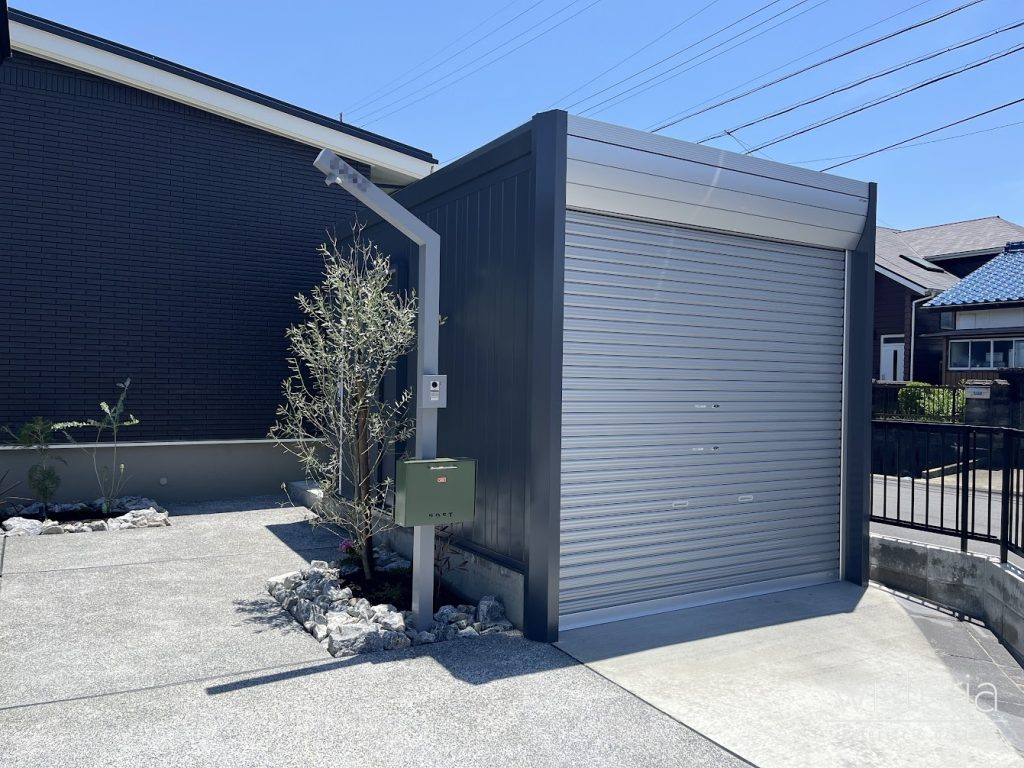 イナバのバイクガレージ アルシアフィット。モダンな造形とカラーリングで、黒い外壁のお家と調和します。