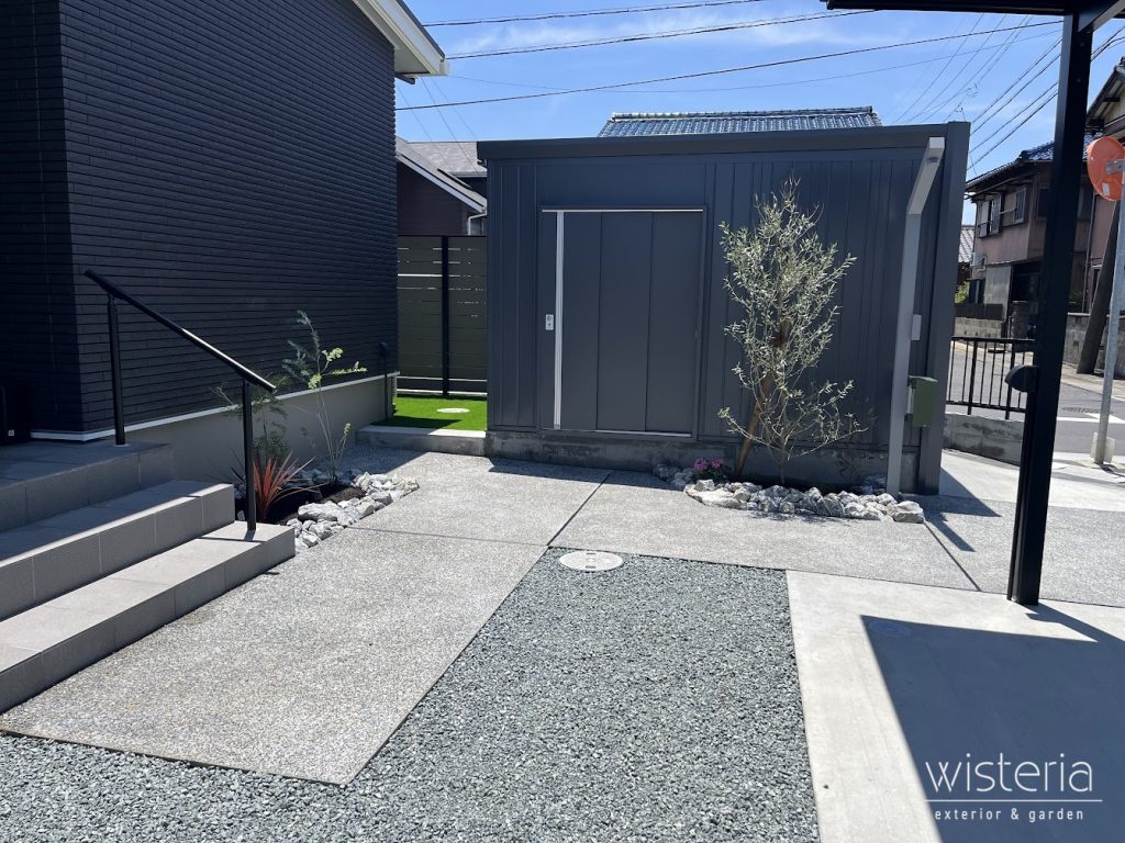 バイクガレージの傍らに佇む、オブジェのような門柱。こだわりのガレージと色が見事にマッチして、並んだ姿もとても自然です。素材は違いますが色のトーンが合わさることでおしゃれなエントランスになりました。