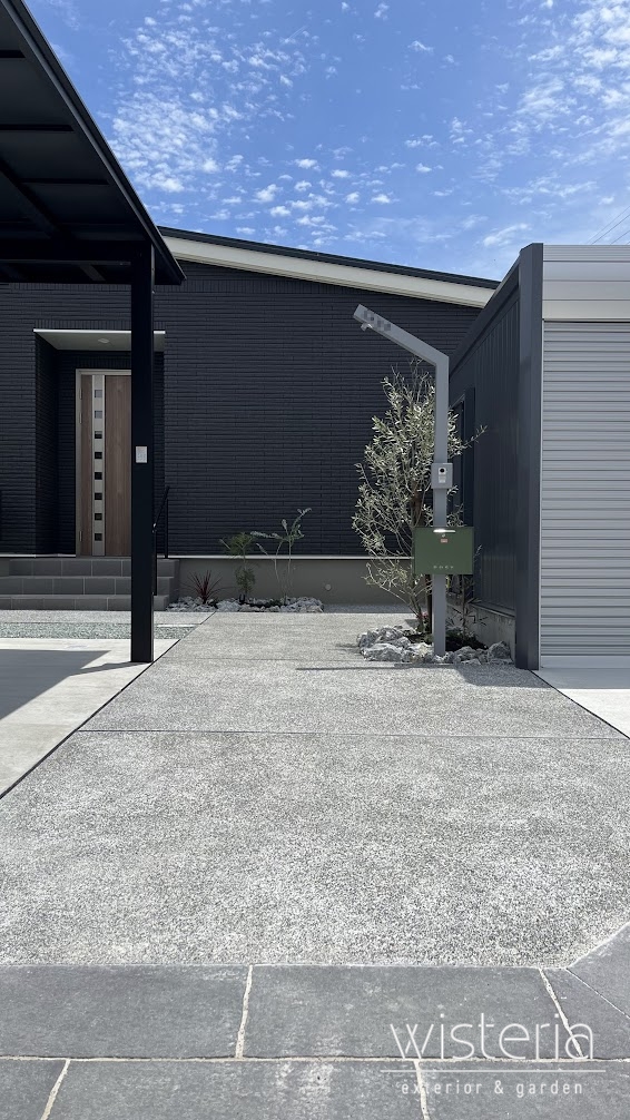 アプローチには洗い出し仕上げを取り入れて、単調になりがちな土間コンクリートにアクセントをプラスしました。