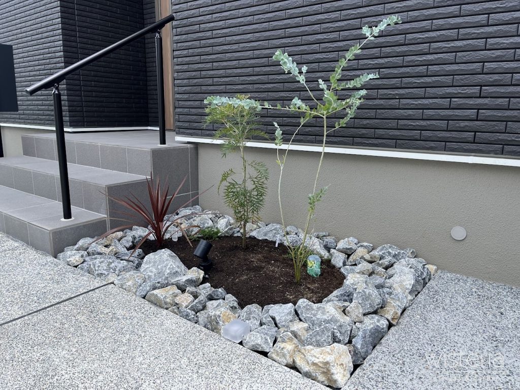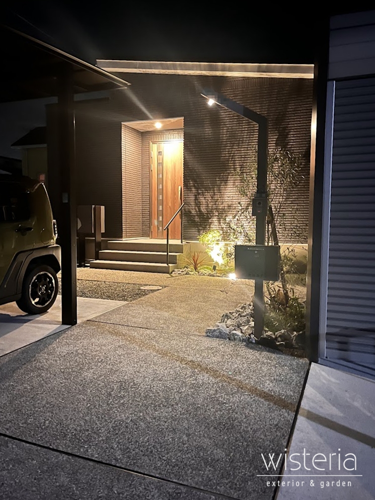 玄関横にはグリーンの映える植栽スペースを。足元には照明を忍ばせました。